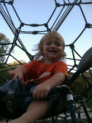 Aidan's favorite perch is (of course) the very top of the spider web thing!