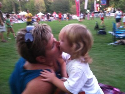 Ok, so here is where the day went from awesome to completely amazing! After Sonia's set, we moved our stuff over to the right of the stage. There was a big open area in the shade (man, it was HOT!) where lots of kids were playing. The space was about the size of a football field, maybe not quite that big. We gave the boys their parameters - don't go past the sidewalk, the woods, the local radio station's tent or the stage. For the next TWO hours, that is exactly where all three of them stayed! The big boys played with several groups of kids - tossing balls, playing catch, just running around and being goofy kids. Not ONE single incident for Aidan. Not ONE! The ENITRE time! Also, he NEVER wandered out of the area, not ONCE! THIS HAS NEVER HAPPENED BEFORE! Now Aidan isn't a runner, but he tends to wander. He has never before been very aware of his surroundings, and where he needs to stay. I have always been scared to take all three boys somewhere wide and open for this reason. Not only did Aidan stay in the area, but he kept a close eye on his brothers, and several times herded one or both of them back towards Gogi and myself. A couple of times, he saw me looking around and waved or called out to me to let me know where he was. I have NEVER before gotten to sit on a blanket and just WATCH my kids play in a wide open place. AMAZING! We had a picnic dinner, and after the sun started to set, a nice breeze kept us cool. Ash took turns loving on me and Gogi, and chasing after his brothers.